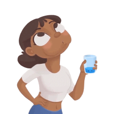 A cartoon woman gargles water with a curious expression, holding a glass with a small amount of blue liquid.
