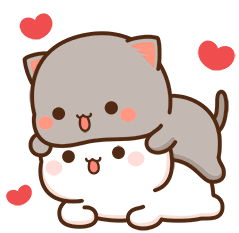 Two adorable cartoon kittens, one grey and one white, cuddling with hearts floating around them, expressing warmth and affection.