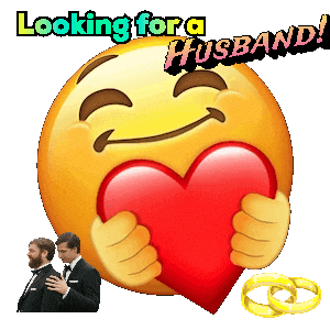 Smiling emoji holding a heart with 'Looking for a Husband!' text, featuring two men and wedding rings.