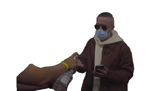 a man wearing a face mask is shaking hands with another man holding a bottle of hand sanitizer
