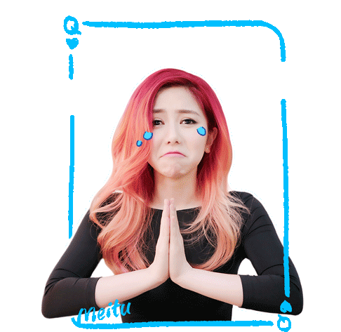 A red-haired woman with tears in her eyes makes a pleading gesture, asking for something with a sad expression.