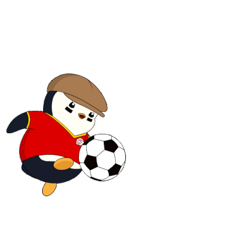 A Pudgy Penguin in a German football jersey and cap, ready to kick a soccer ball with determination.