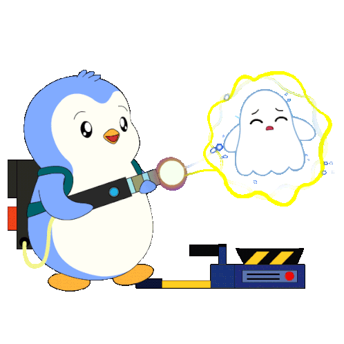 a cartoon penguin is holding a flashlight and a ghost is coming out of it