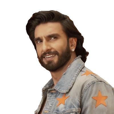 Rocky Randhawa (Ranveer Singh) gazes confidently, wearing a stylish denim jacket with stars. Perfect for expressing a charming stare.