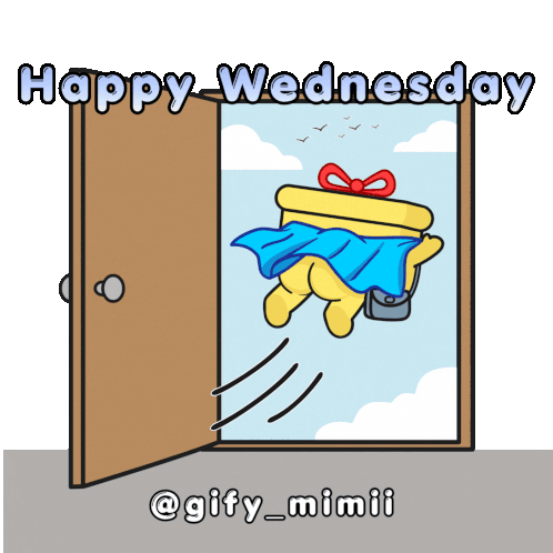 a happy wednesday greeting with a cartoon character flying out of a door