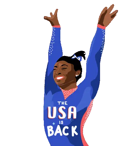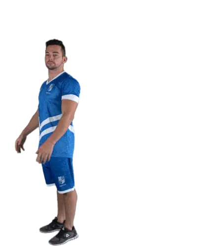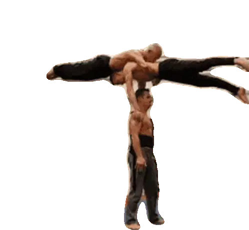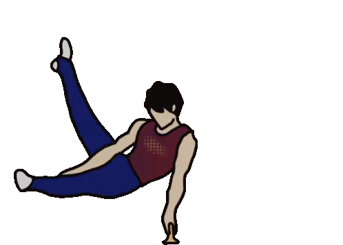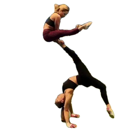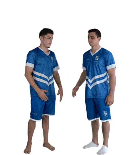 Two gymnasts from Minas TĂȘnis Clube in their blue uniforms greet each other and then perform a synchronized dab.