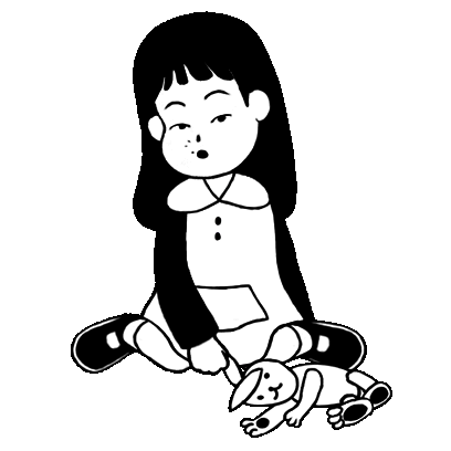 A cute line art drawing of a young girl with long dark hair, peacefully sleeping while sitting on the floor next to her rabbit toy.