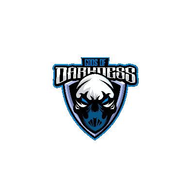 An animated logo featuring a stylized skull with glowing blue eyes, set within a shield, and the text 'GODS OF DARKNESS'.