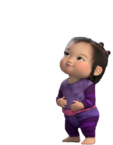An adorable baby from Raya And The Last Dragon stands and raises its arms, cutely asking for something with a 'Give Me' gesture.