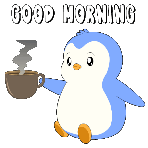 A cute blue and white penguin holds a steaming cup of coffee, wishing "GOOD MORNING" to start the day.