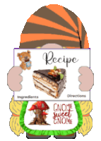 A cheerful gnome chef holds a recipe card with a cake, ready to cook.