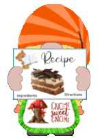 A charming gnome proudly presents a sign clearly labeled 'RECIPE', inviting culinary adventures.