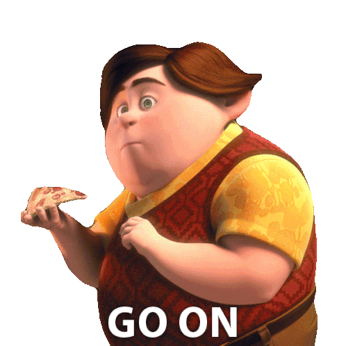Toby Domzalski from Trollhunters holds a pizza slice, encouraging with "Go On".