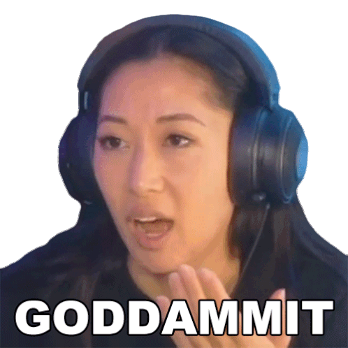 Mariko Takahashi, wearing headphones, expresses frustration with the word 'Goddammit' displayed below her.