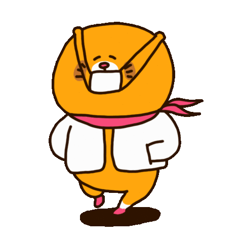 A cute orange character wearing a white jacket, pink scarf, and face mask, walking outdoors.