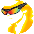 A pixelated golden and yellow abstract shape, possibly a face or head with a dark, colorful visor, spinning rapidly.