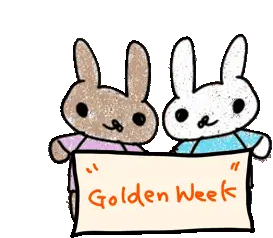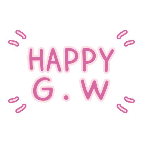 A vibrant animated sticker wishing "HAPPY G.W" in pink letters, celebrating Japan's Golden Week holiday with cheerful sparkles.