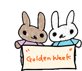 Two cute cartoon rabbits, one brown and one white, holding a sign that says 'Golden Week' to celebrate the holiday.