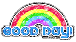 A vibrant rainbow shimmers with blue glitter and sparkles, displaying a cheerful 'Good Day' message. Perfect for daily greetings.