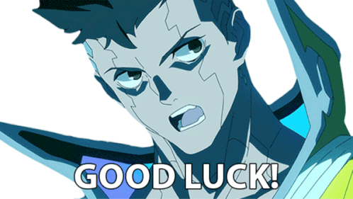 David Martinez from Cyberpunk: Edgerunners offers a determined 'Good Luck!' This animated sticker is perfect for sending well wishes.