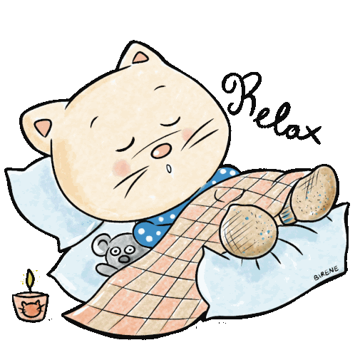a drawing of a cat laying on a pillow with the word relax written above it