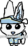 A charming pixel art white rabbit wearing a blue hat and red scarf waves, wishing a good morning.
