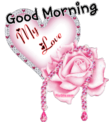 A sparkling animated sticker featuring a pink glittery heart with a rose, displaying 'Good Morning Love' amidst shimmering sparkles.
