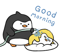 A cute penguin splashes another sleeping penguin with water from a hose to say good morning.