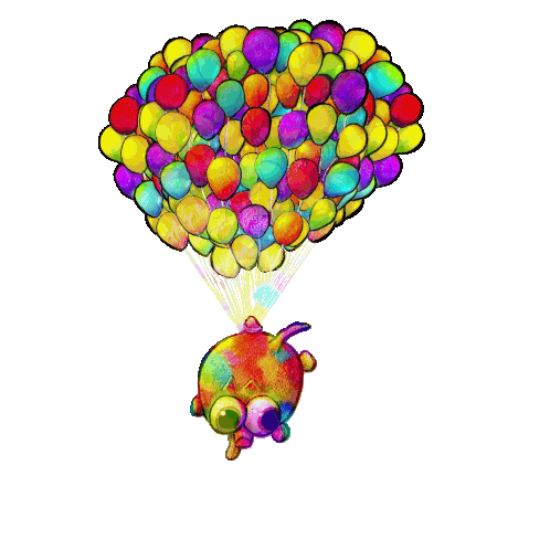 a colorful cartoon character is flying through the air with balloons