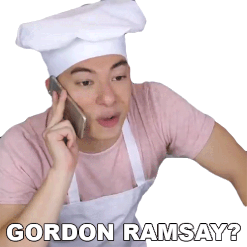 Motoki Maxted, dressed as a chef, holds a phone to his ear with a surprised expression, asking "Gordon Ramsay?".