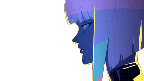 Lucy from Cyberpunk Edgerunners, with her distinctive purple hair, asks 'GOT A PROBLEM?' in this animated sticker.