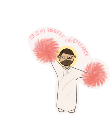 a cartoon of a man holding pom poms with the words he is my biggest cheerleader