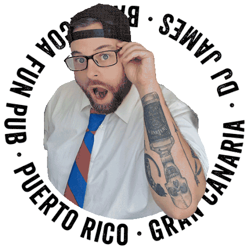 DJ James, the lively host of Barbacoa Fun Pub in Gran Canaria and Puerto Rico, reacts with surprise in this animated sticker.