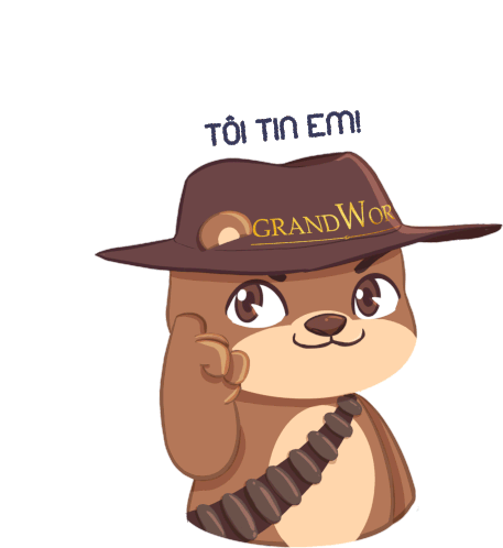A friendly Grand World bear winks, gives a thumbs-up, and says 'I Believe In You!' showing support and trust.