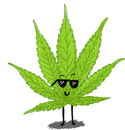 An animated green cannabis leaf character wearing cool sunglasses, subtly swaying with small legs and a friendly smile.