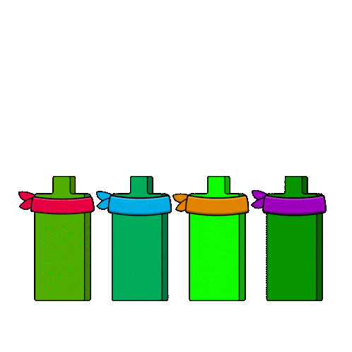 four green bottles with bandanas around their necks are lined up in a row on a white background