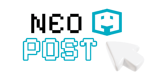 A white cursor points and clicks on the "NEO POST" text, featuring the Grobotronics cube logo.