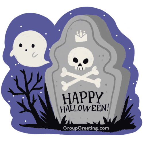 Spooky animated sticker featuring a friendly ghost, a gravestone with 'Happy Halloween!' text, and a skull and crossbones.
