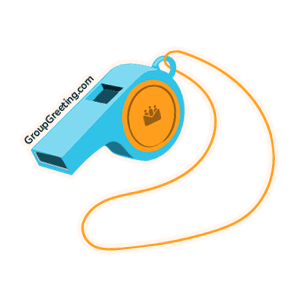 An animated sticker of a blue and orange whistle with "GroupGreeting.com" for coach appreciation.