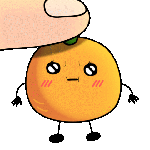A cute, grumpy orange character with blush marks is being pressed on the head by a large finger, showing annoyance.
