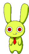 Grunny, the green bunny character from Gaiaonline, stands with a red tie, showing happy and worried expressions.