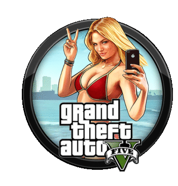A blonde woman in a red bikini takes a selfie, making a peace sign, featured in a Grand Theft Auto V icon.