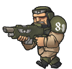 An animated sticker of a cartoon Guardsman from Warhammer 40k, armed with a rifle and ready for action.