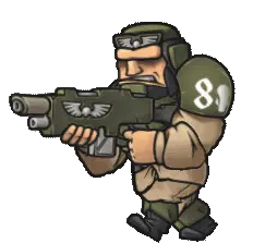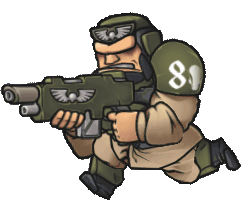 A determined Warhammer 40k Imperial Guardsman, wearing olive green armor with '81' on his shoulder, holds a lasgun.