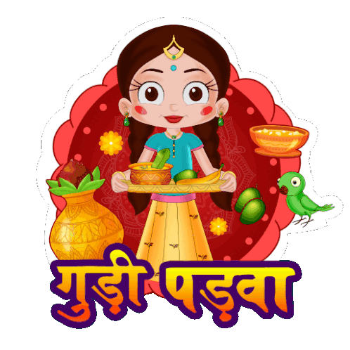 a cartoon illustration of a girl holding a tray of fruits and vegetables with the words " gudi padwa " above her