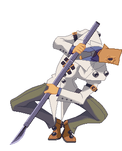 Pixel art of Guilty Gear's Faust, a character with a paper bag head, holding a spear in a dynamic pose.