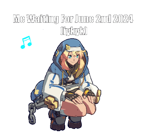 Bridget from Guilty Gear Strive crouches, waiting for June 2nd 2024, with music notes.