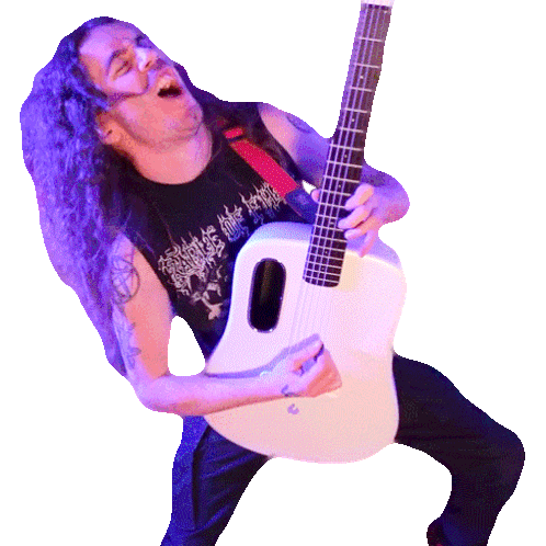 Bradley Hall passionately performs a guitar solo, rocking out with long hair and an open mouth while playing a white guitar.