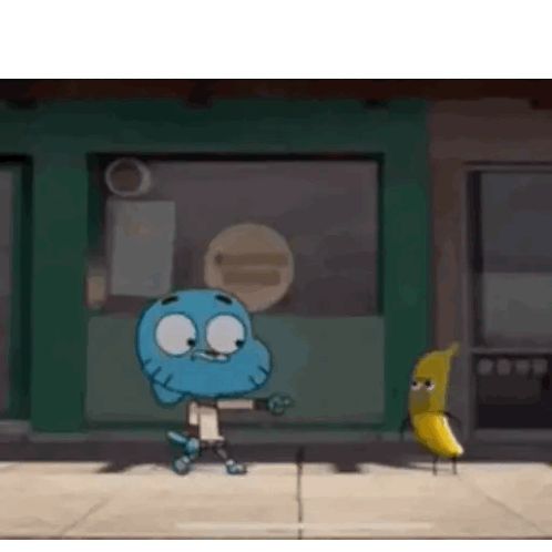 Gumball Watterson points and reacts with confusion and anger towards Banana Joe, who looks equally confused.