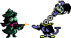 Ralsei and Jevil from Deltarune in a pixel art sticker, with Ralsei shooting a gun and Jevil reacting with a funny face.